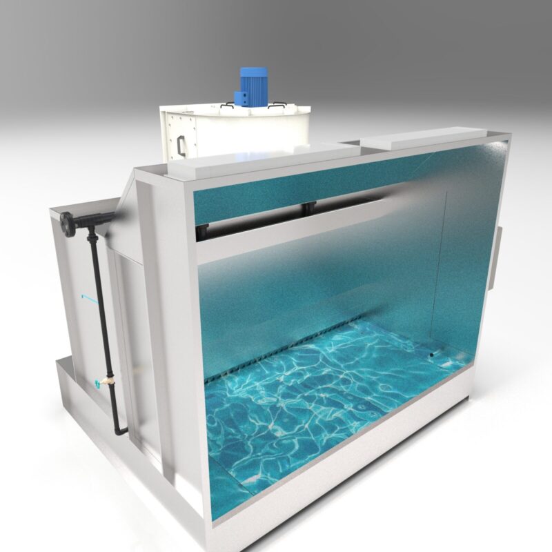 ห้องพ่นสีเวนทูรี+ม่านน้ำ เหมาะกับอุตสาหกรรมที่มีชิ้นงานพ่นสีอย่างต่อเนื่องและปริมาณมาก โดยใช้น้ำเป็นตัวดักจับละอองสี รวมถึงช่วยดูดซับกลิ่นตัวทำละลายต่าง เช่น Xylene, Toluene, MEK