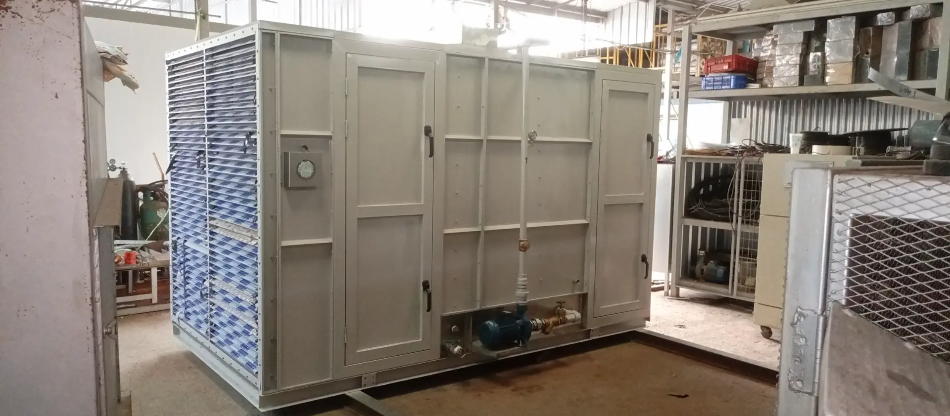 -โครงสร้างชุดพัดลมจ่ายพร้อมระบบกรองฝุ่น ผลิตจากเหล็กแผ่นซิ้งค์ EG (เป็นเหล็กแผ่นชุบสังกะสีด้วย